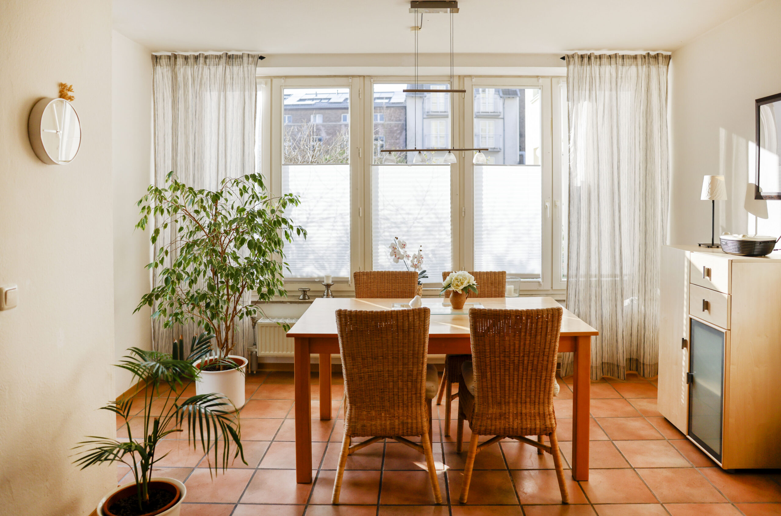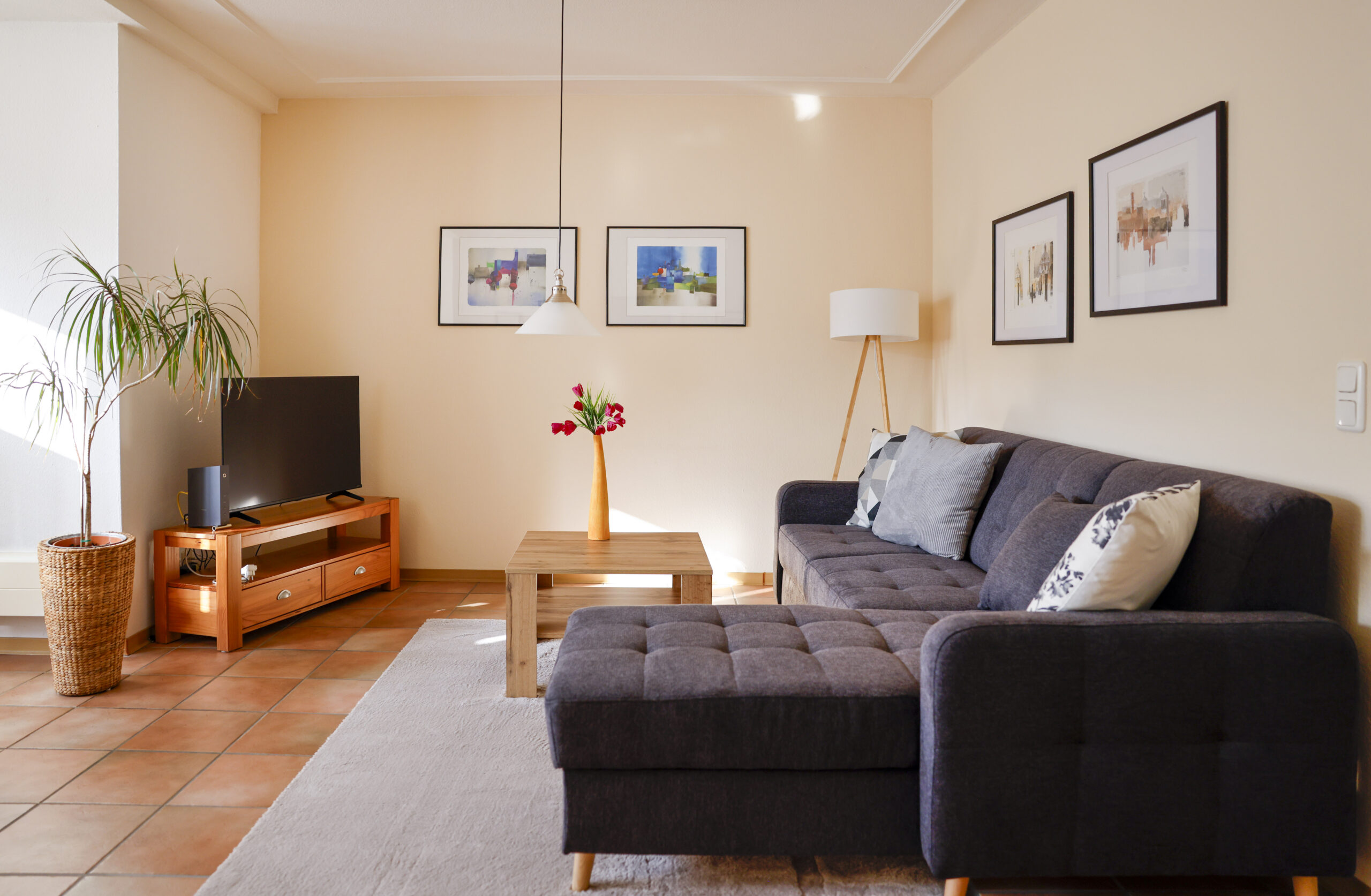 • In allen Räumen (außer Schlafzimmer) befinden sich pflegeleichte Keramik-Bodenfliesen.